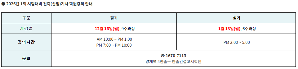 한솔아카데미 건축(산업)기사 학원강의 겨울방학 특강 개설 안내